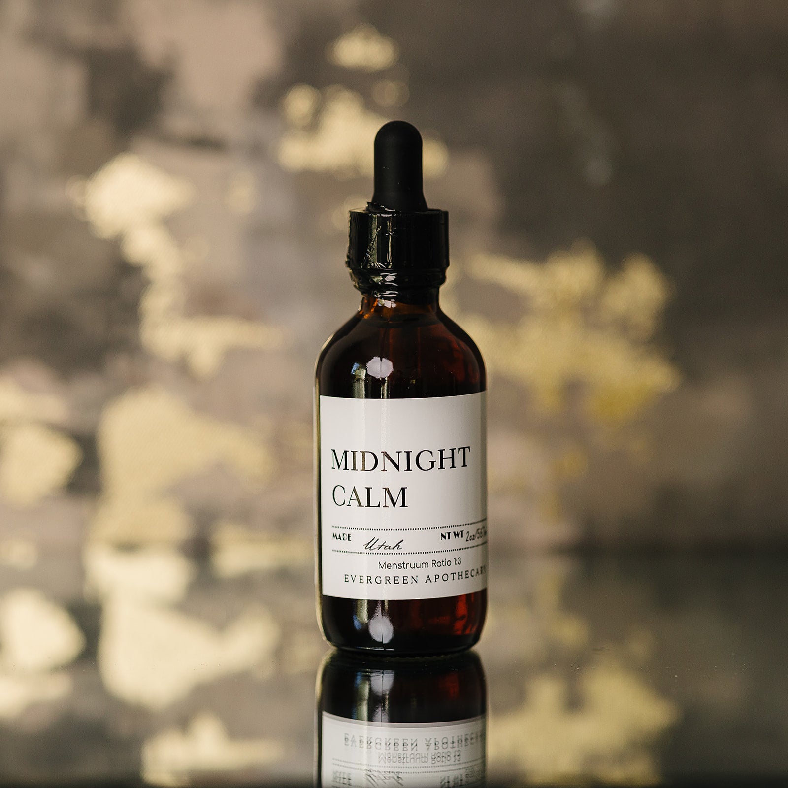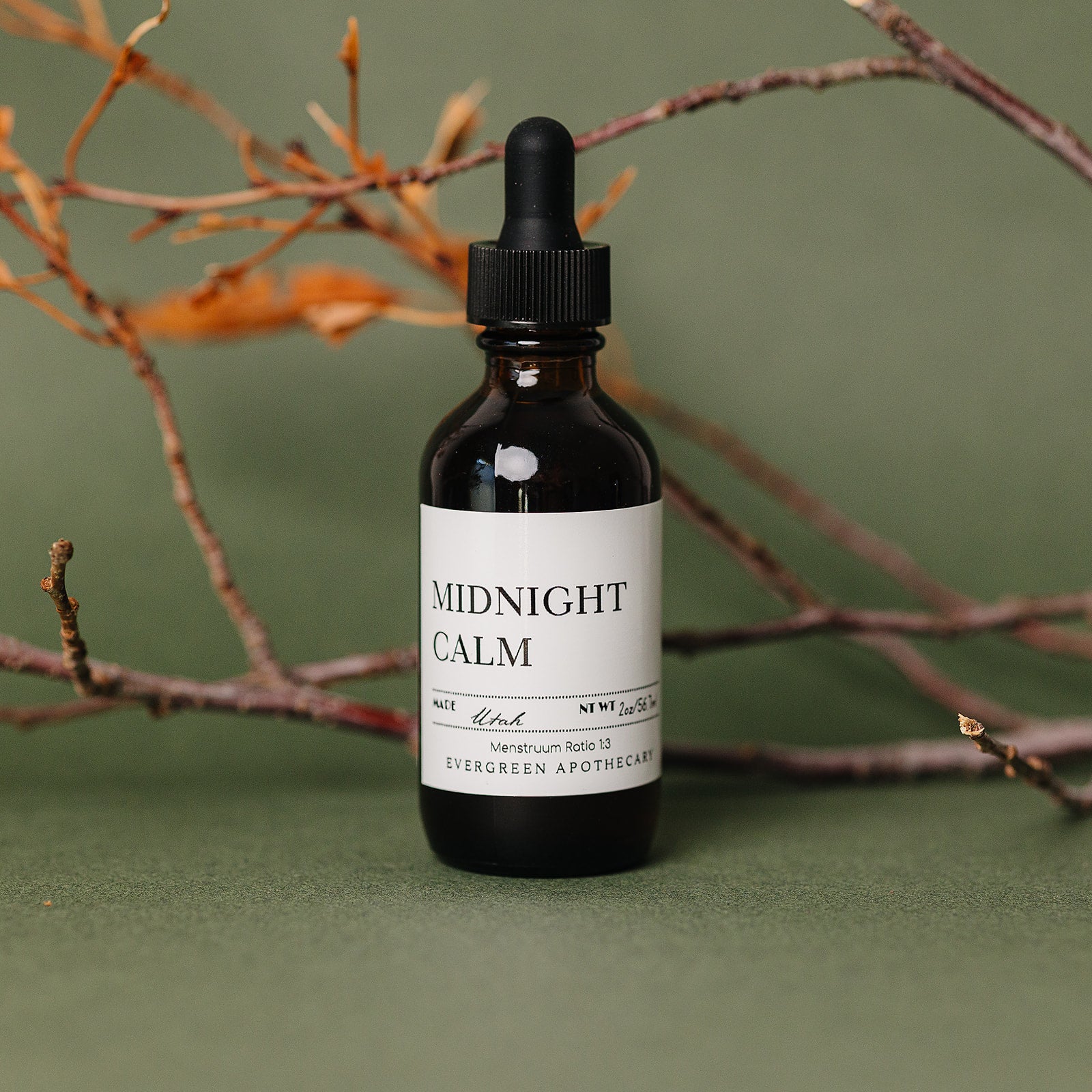 Designed for those who struggle with nighttime wakefulness, Midnight Calm Tincture combines carefully selected botanicals to support restful sleep. Mugwort settles an overactive mind and nervous tension that disrupts rest, while motherwort addresses anxiety-related sleep disturbances and hormonal fluctuations with its heart-calming properties. Chamomile soothes digestive discomfort triggered by stress and eases physical tension that interferes with sleep, working through apigenin compounds that engage relaxation pathways in the brain. Together, these herbs gently ease the nervous system into deeper rest without heavy sedation. Crafted with organic mugwort, motherwort, and chamomile in vegetable glycerin and distilled water.