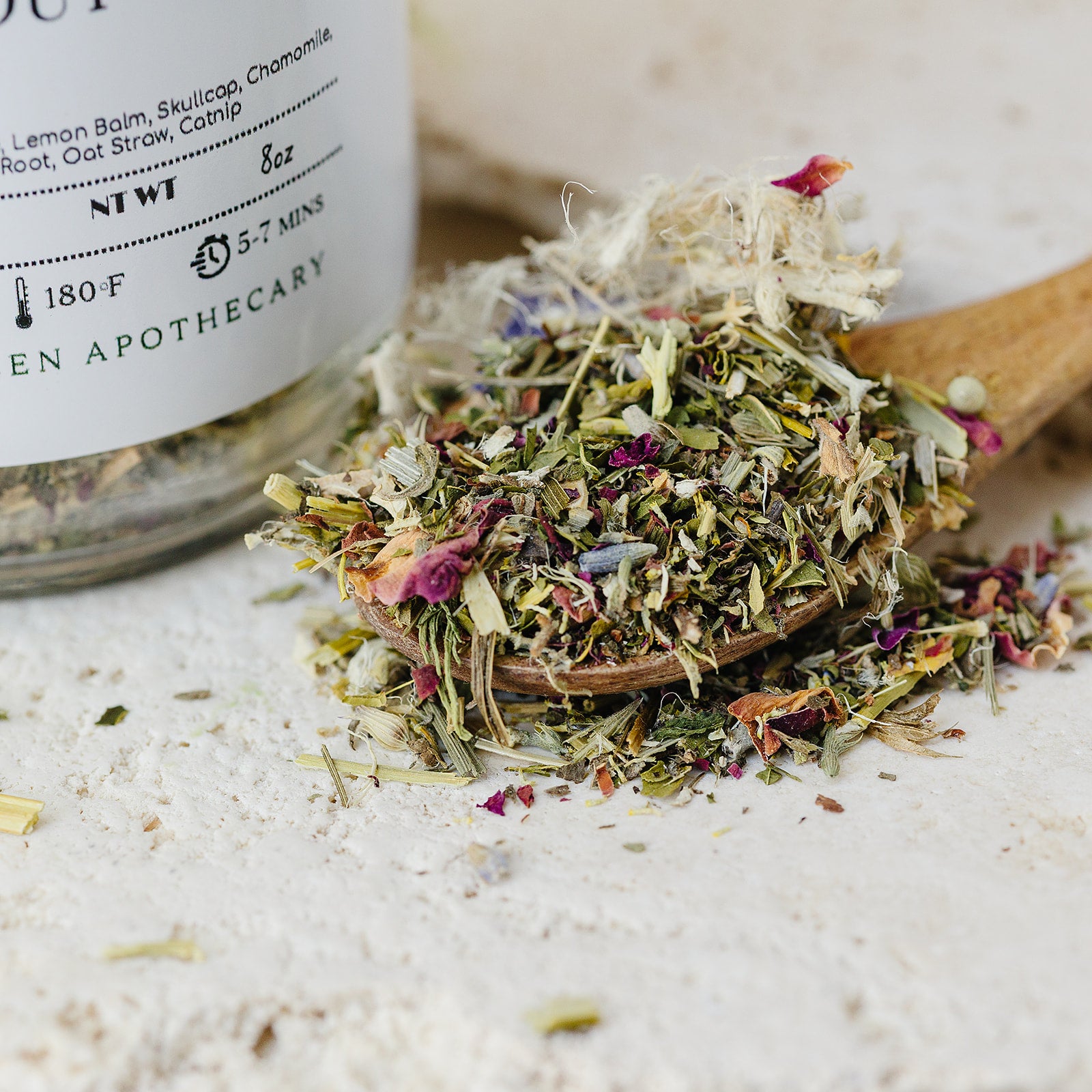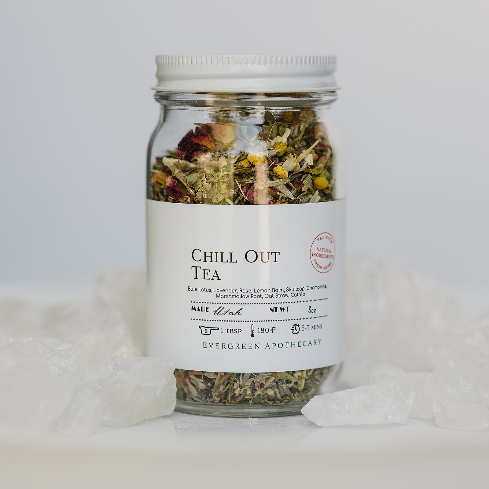 Unwind with our bestselling Chill Out Tea, a thoughtfully blended herbal infusion designed to ease tension and quiet an overactive mind. This 8oz glass jar contains wild-harvested and organic ingredients including blue lotus, lavender, rose, lemon balm, skullcap, chamomile, marshmallow root, oat straw, and catnip. Each cup supports relaxation, promotes restful sleep, and encourages mental clarity. Whether you're managing daily stress or seeking deeper calm, this versatile blend offers multi-faceted support for both body and mind—some enthusiasts even report enhanced dream recall. A customer favorite for good reason.