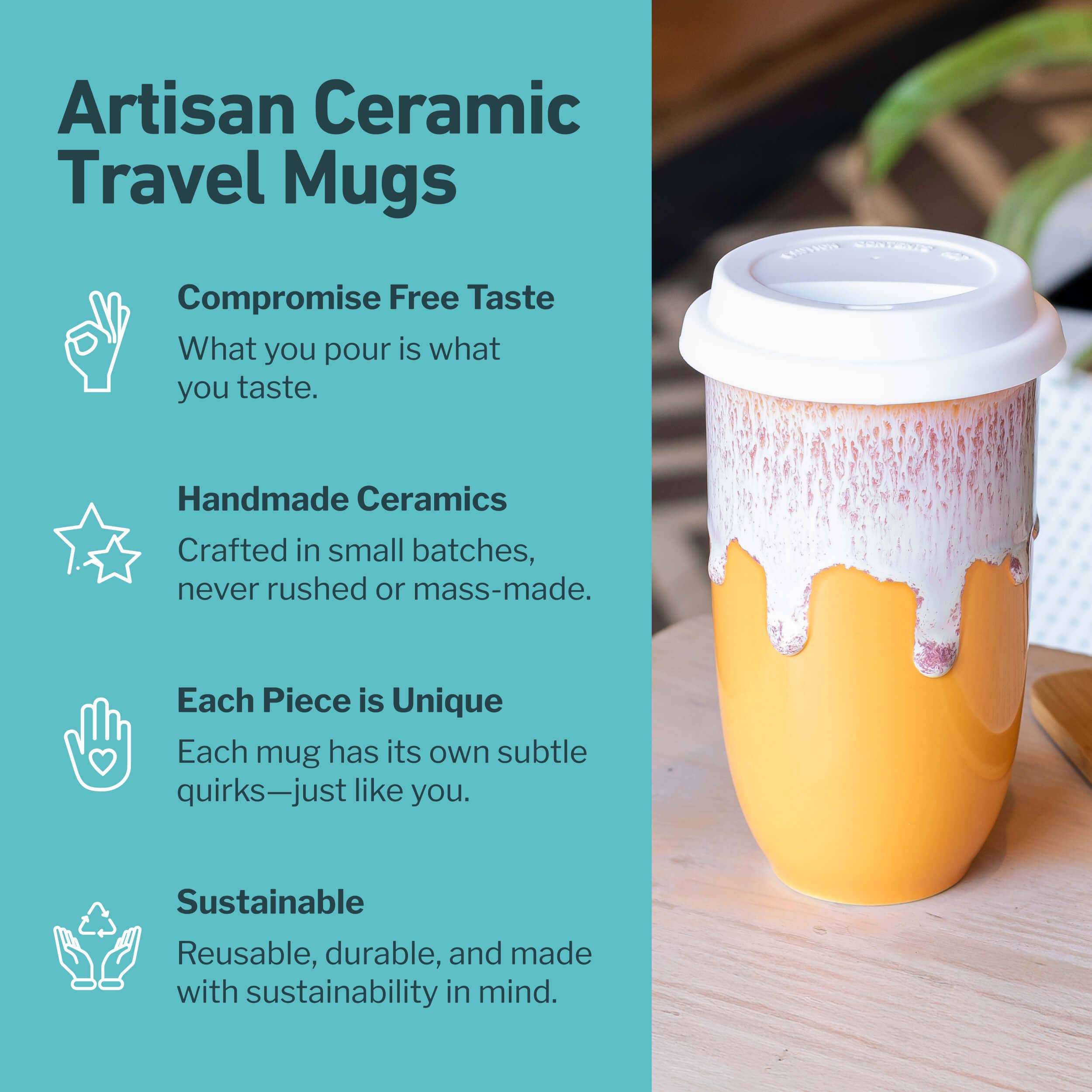 Expertly handcrafted with sustainability in mind, each cup is one-of-a-kind thanks to our custom glazing technique. Made from premium stoneware ceramic, it delivers a pure, clean-tasting sip. Complete with a BPA-free silicone lid and heat sleeve, it’s designed for seamless use—whether you're at home or on the move.