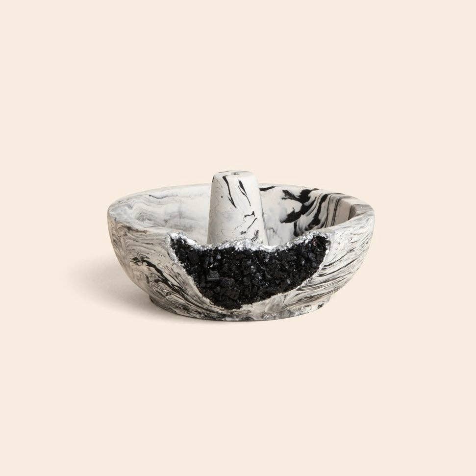 Revitalize your space with our modern incense holder featuring a sleek round design, highlighted by a black tourmaline geode accentuated with silver chrome leaf detailing. The color of the holder is marbled black, white & grey. Standing at 2.3 inches high and 4.6 inches wide, this contemporary piece seamlessly combines style and functionality, creating a striking addition to your decor. Ignite good vibes in your space!
